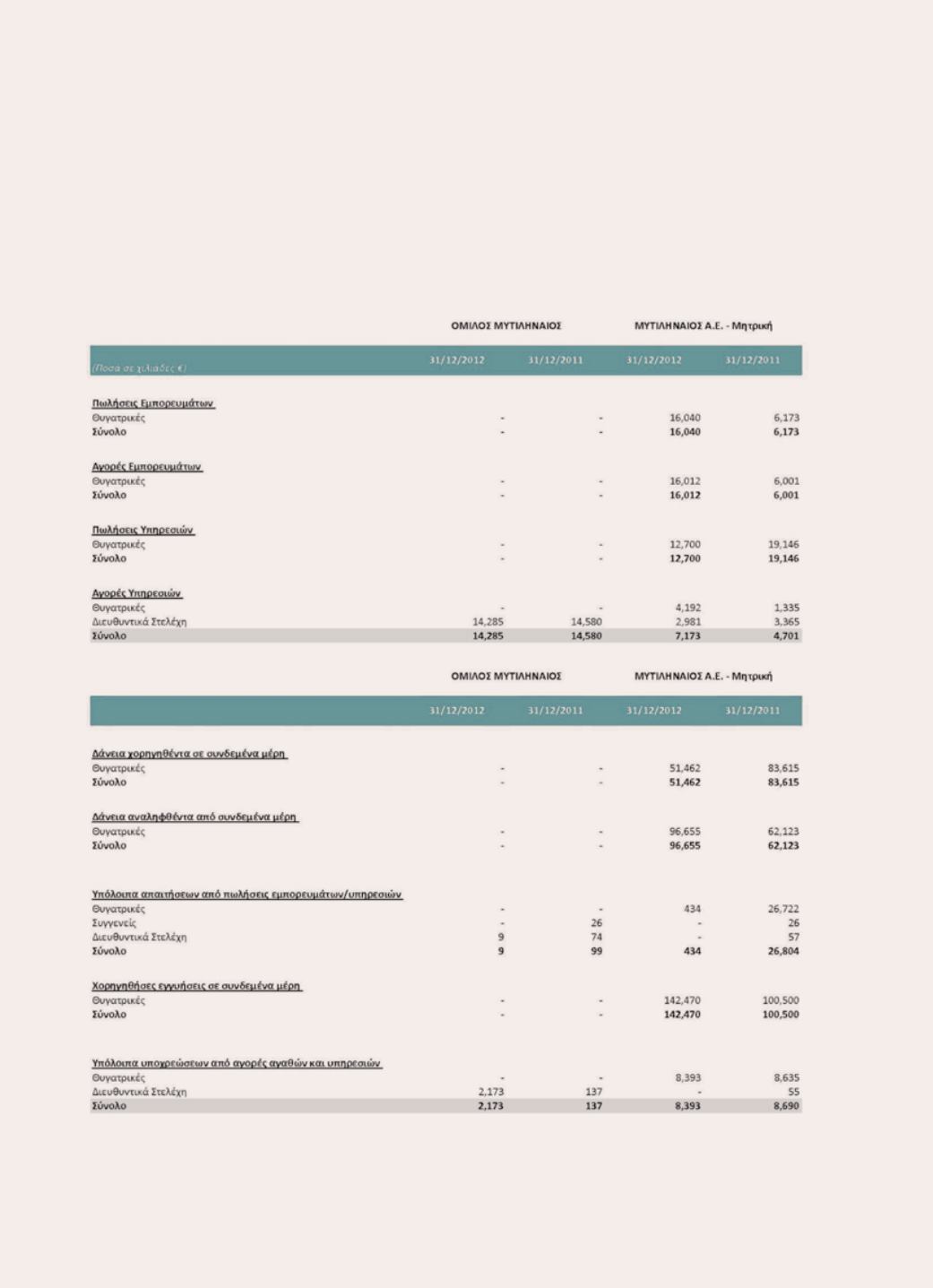 ενοποίησης έχουν απαλειφθεί. Ακολουθούν πίνακες που απεικονίζουν τις απαιτήσεις, τις υποχρεώσεις, τα έσοδα