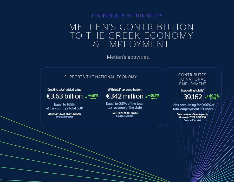 Metlen, in order to inform all its Stakeholders about the value it creates not only for itself but also for its entire value chain, implements every 2 years a special study, applying the internationally recognized methodology of the "Input-Output" Model , to determine the socio - economic impact of its activity in Greece. The results of the relevant studies confirm the long-term responsible attitude and the broader contribution of Metlen to the national economy and employment, contributing at the same time to the UN Sustainable Development Goals 8 & 9 achievement, related to economic growth and strengthening employment in the industrial sector respectively.